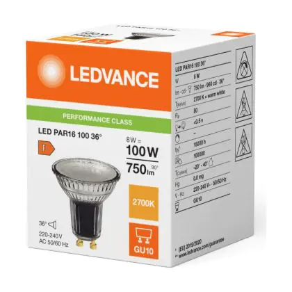 Beschrijving Ledvance LED PAR16 GU10 Reflector 8W 750lm 36D - 827 Zeer Warm Wit | Vervangt 80W