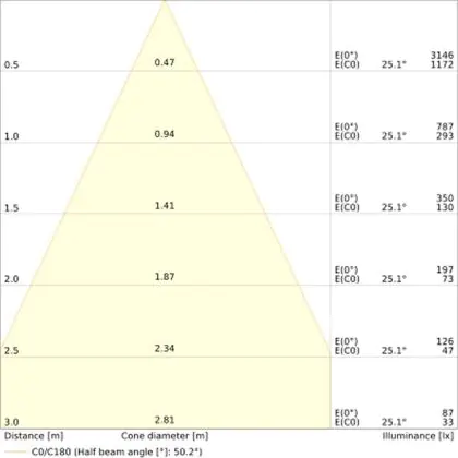 De lichtopbrengst en de gradenbundel spelen een grote rol. Zo geeft de lichtopbrengst van 840 Lumen in combinatie met de 60° stralingshoek deze inbouwspot een specifieke toepassing. Kort samengevat is een lichtintensiteit van maximaal 400 Lumen ideaal voor accentverlichting, terwijl hogere waardes goed gebruikt kunnen worden als basisverlichting. Over het algemeen geldt: hoe breder de gradenbundel, hoe geschikter deze is door basisverlichting. Dit komt doordat het licht over een groter oppervlak wordt verspreid. Smallere gradenbundels (tot 40°) kunnen echter bij hoge plafonds ook goed tot hun recht komen als algemene verlichting.