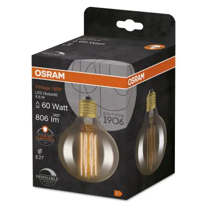 Beschrijving Osram Vintage 1906 LED E27 Globe Filament Gold 80mm 8.8W 806lm - 822 Extra Warm White | Dimmable