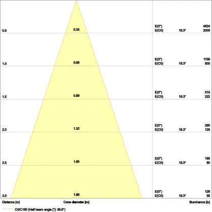 De lichtopbrengst en de gradenbundel spelen een grote rol. Zo geeft de lichtopbrengst van 570 Lumen in combinatie met de 36° stralingshoek deze inbouwspot een specifieke toepassing. Kort samengevat is een lichtintensiteit van maximaal 400 Lumen ideaal voor accentverlichting, terwijl hogere waardes goed gebruikt kunnen worden als basisverlichting. Over het algemeen geldt: hoe breder de gradenbundel, hoe geschikter deze is door basisverlichting. Dit komt doordat het licht over een groter oppervlak wordt verspreid. Smallere gradenbundels (tot 40°) kunnen echter bij hoge plafonds ook goed tot hun recht komen als algemene verlichting.