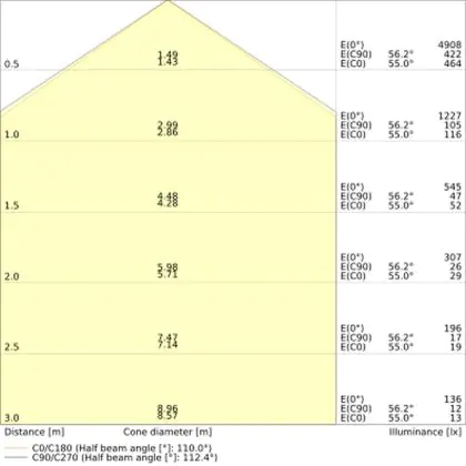 De lichtopbrengst (Lumen), geeft weer hoe krachtig het uitgestraalde licht is. Dit is belangrijk om te weten om de juiste sfeer te creëren. 0 tot 400 Lumen is bij uitstek geschikt voor accent- of sfeerverlichting. Een hoger aantal Lumen is, afhankelijk van de grootte van de ruimte, beter geschikt als ondersteunende- of basisverlichting. Heb je plafonds hoger dan 4 meter, dan is een lichtopbrengst van minimaal 8000lm aan te raden indien heldere verliching gewenst is (vb. in werkomgevingen).